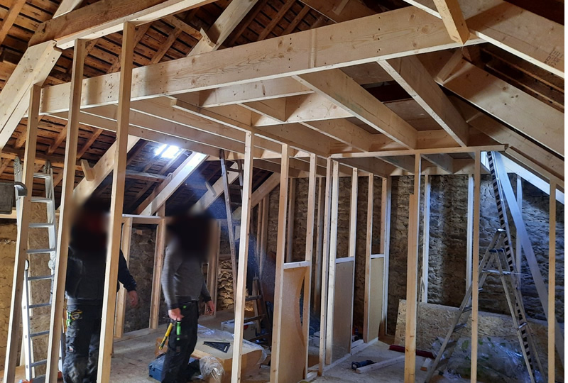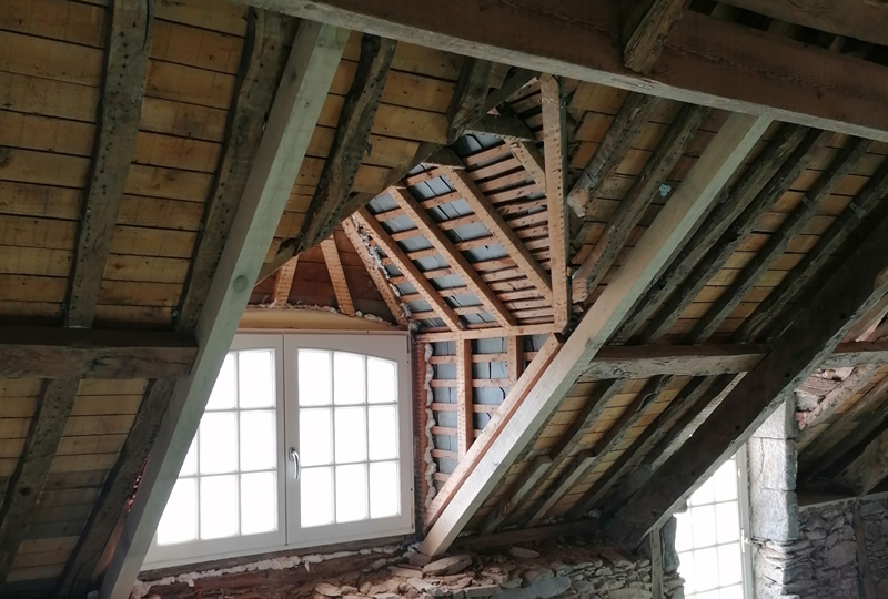 redressement de charpente - Par sarking( chevron) Isolation fibre de bois - Remise a niveau - rénovation de 3 lucarnes