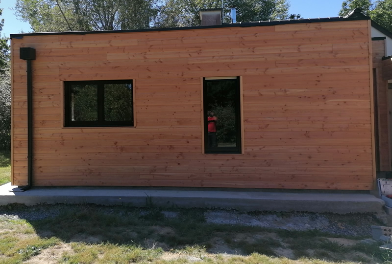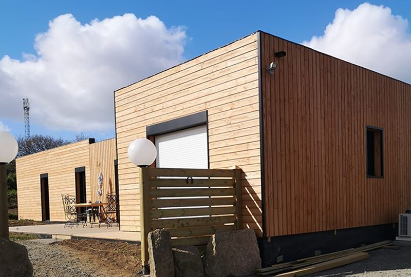 Maison ossature bois de 94M² - Structure Epicéa 45*220 - Isolant en fibre de bois 220mm - Menuiseries alu + volet roulant - Bardage douglas naturel - Cloisonnement intérieur - Charpente chevron porteur