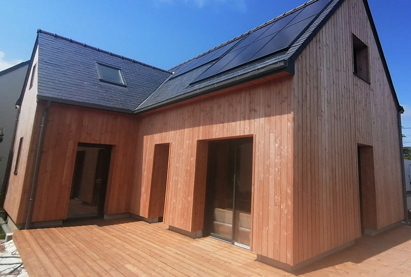 Maison ossature bois de 150M² sur dalle - Structure Epicéa 45*200 - Isolant en 200mm - Menuiserie alu noire + volet roulant - Bardage douglas profil viking - Couverture Membrane EPDM